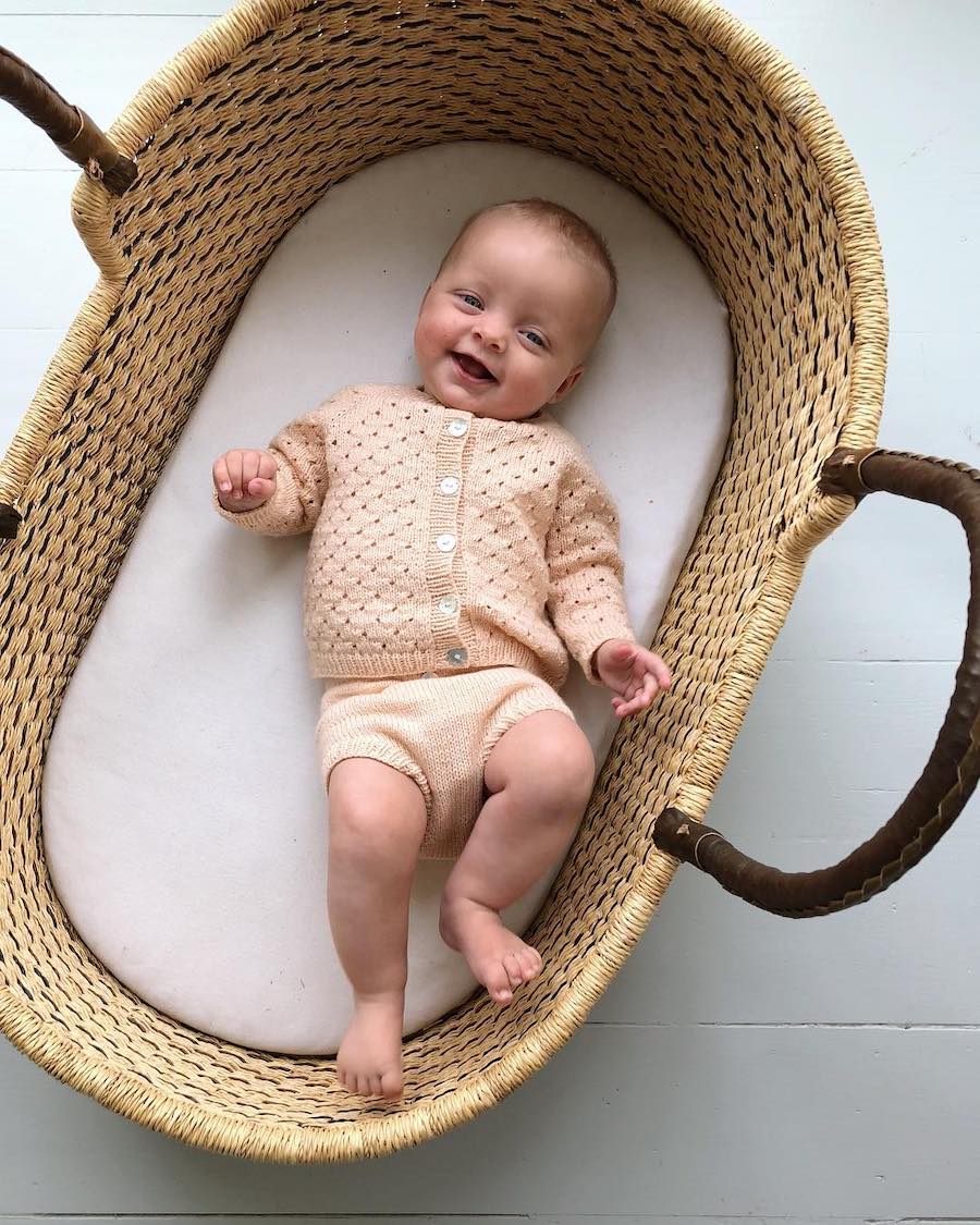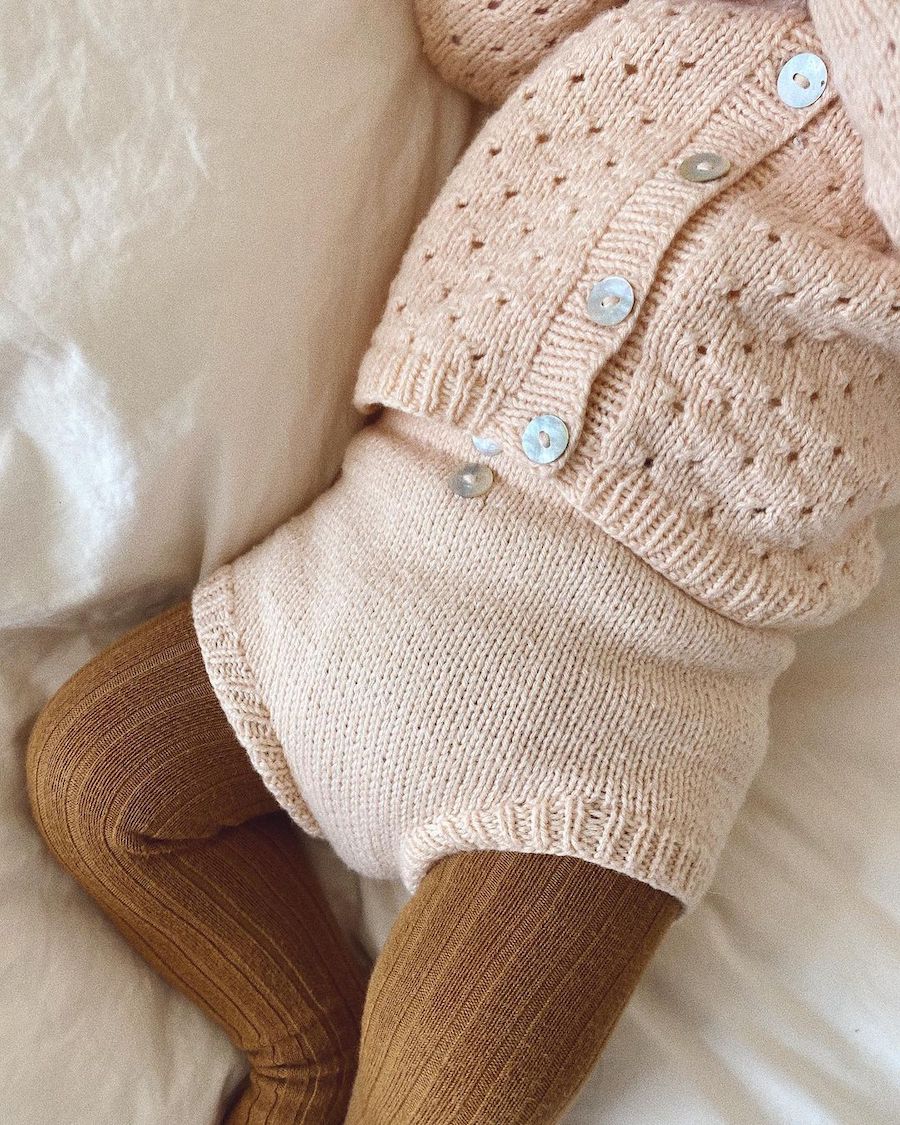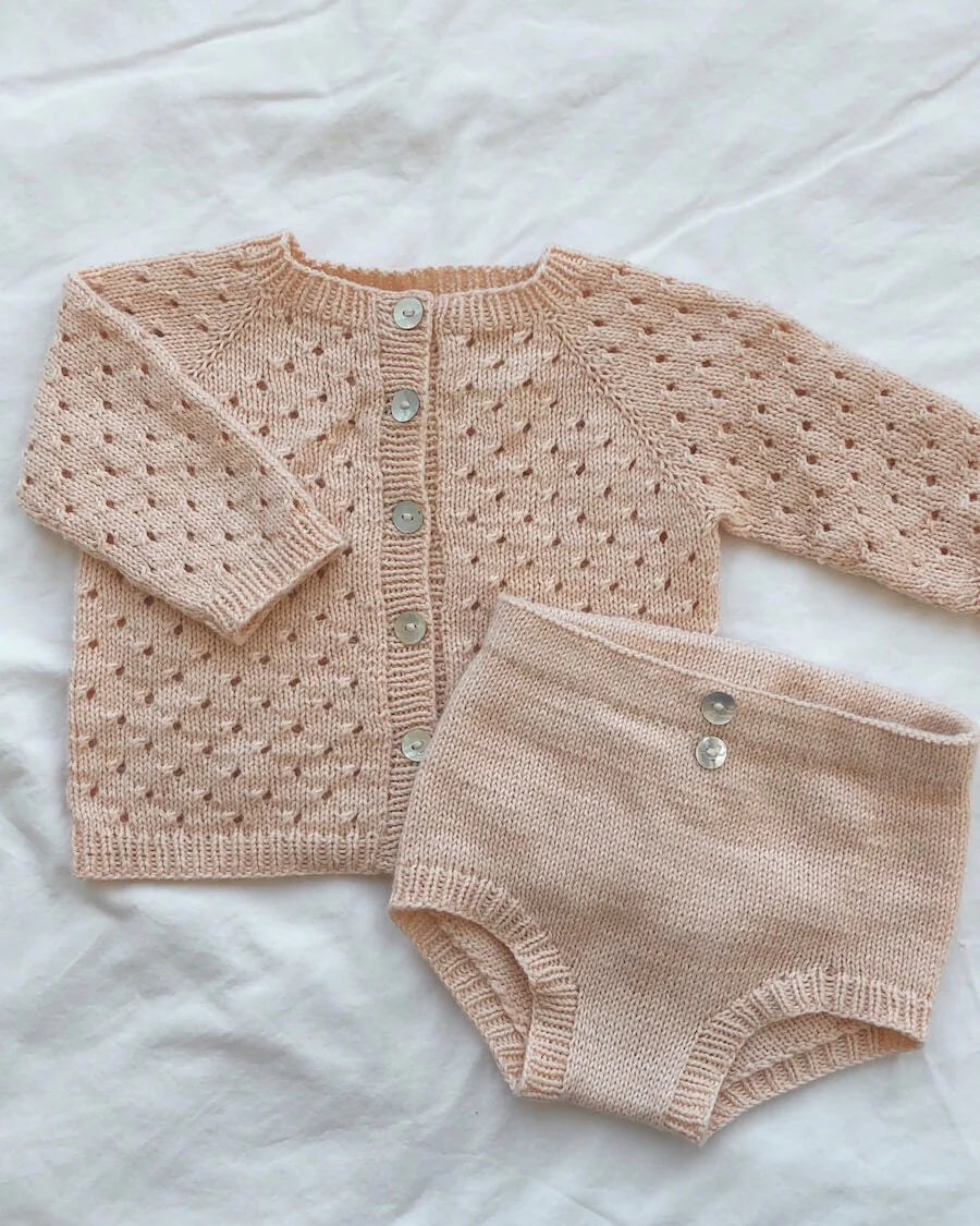 El conjunto de juego Ellen's es un patrón de dos piezas: un cardigan con un patrón de ojales y un bombacho en punto jersey.