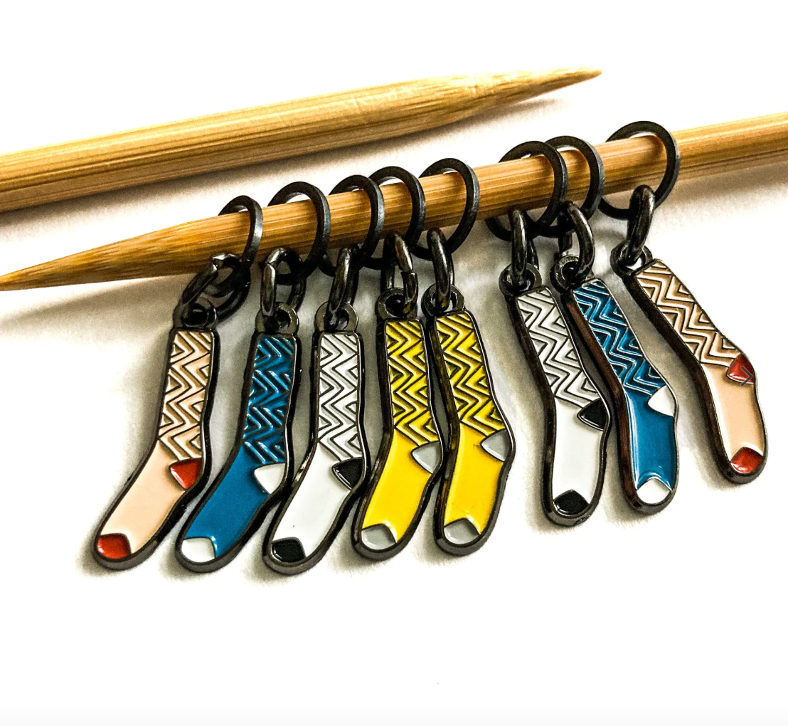 “Saco de calcetines” contiene 8 dulces calcetines esmaltados en 4 colores diferentes (2 de cada uno), en una anilla redonda de 10 mm anti enganches.