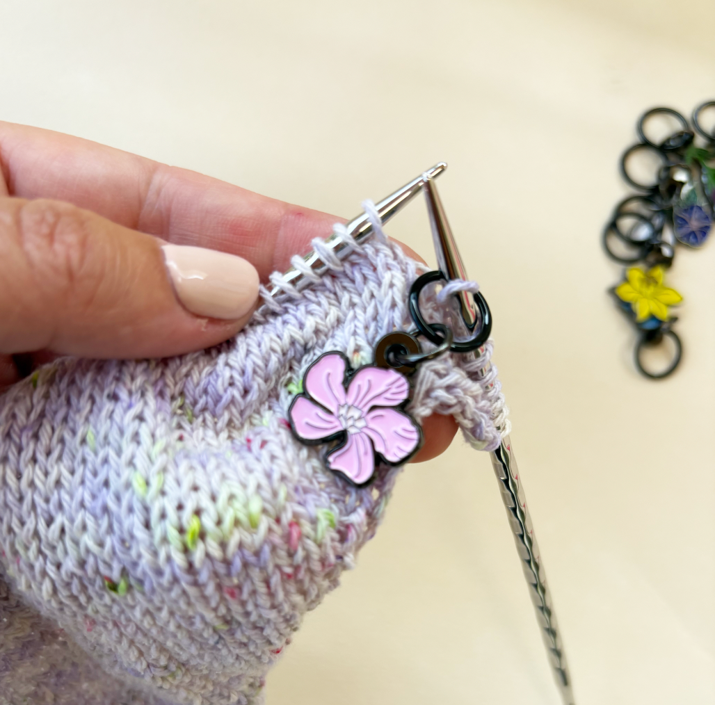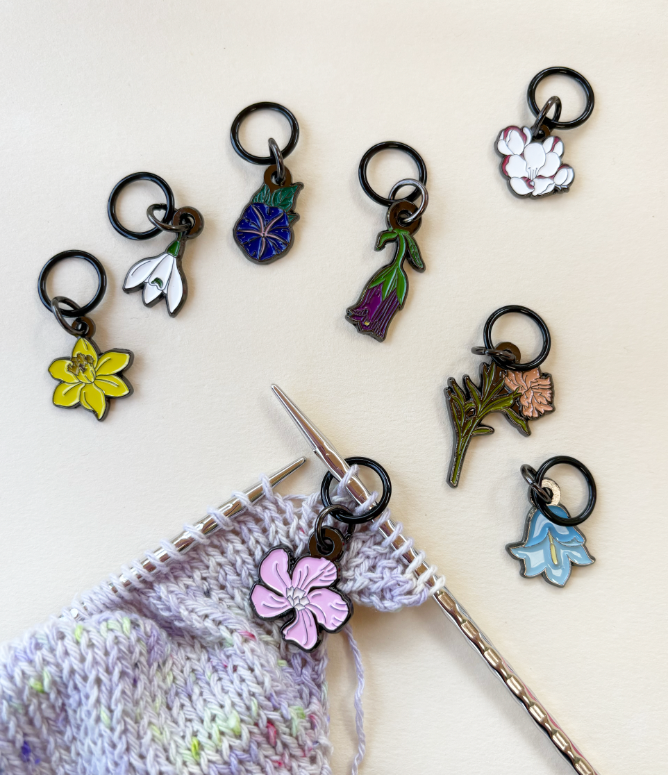Cada paquete incluye 8 marcadores de punto esmaltados con diseño personalizado, cada uno con una flor diferente en una anilla redonda de 10 mm anti enganches.